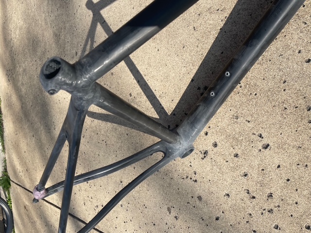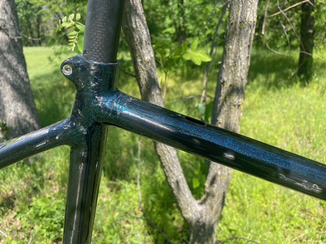 As carbon became more prevelant I began to have an interest in that material. I was able to source a Dedaccai frame kit, tubing, lugs, dropouts. When I was putting it together, something didn't seem right about it. I knew how to build a frame and this one didn't seem to go together the way it should. Well, fast forward to it very first ride. The seat lug cracked, right across the seat tube/top tube junction. After checking into warranty on the kit, I was told I needed to cut out the section and send it back and they would send me a new kit as a replacement. I decided to look at repairing it, as I didn't have an accessible jig at the time. My rudimentary repair held for the rest of the season.
